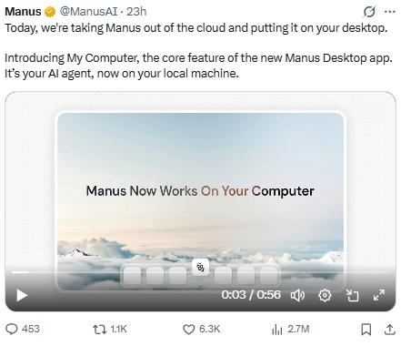 Manus released My Computer, a desktop application allowing its AI agent to step outside the browser. Users on macOS and Windows can now let an AI interact directly with local files and hardware; representing a foundational shift from agents that live in the cloud, to ones that live on your computer 24/7.