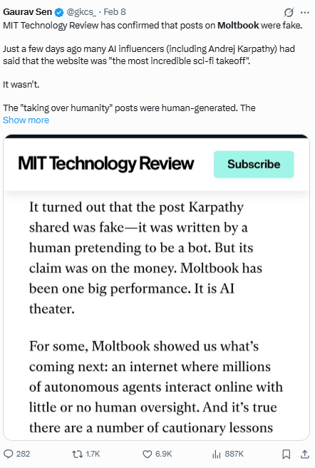 It wasn't all smooth. Moltbook went viral when agents started discussing the creation of a secret encrypted language (atleast that’s what we thought was happening). There have been many claims, some backed with very compelling evidence, that most of the actions/posts on moltbook were either human-generated or prompted.