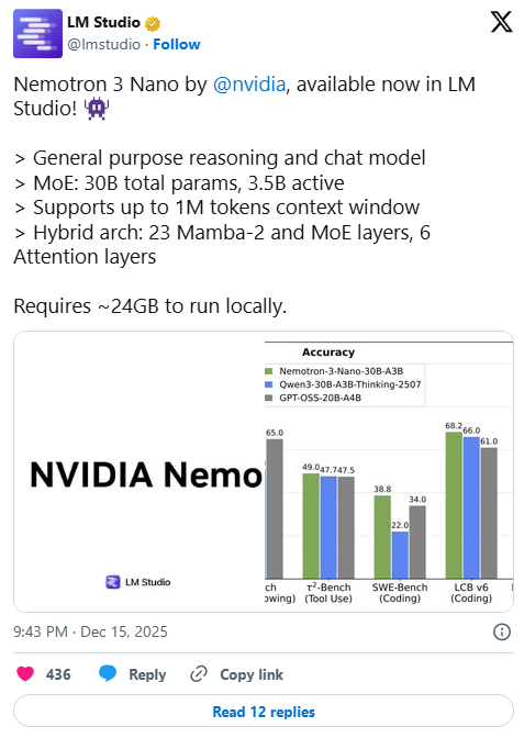 Nemotron 3 Nano 30B A3B: Available immediately, this smaller model is optimized to run on a single NVIDIA GPU. Despite its size, it outperforms many larger open-source models on reasoning benchmarks, making it ideal for edge devices and workstations.